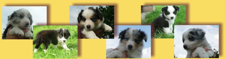 Jedna blue merle s pálením, jedna blue merle a jedna tricolorní holčička a dva černobílý a jedem blue merle kluk.