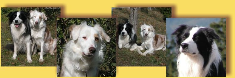 Jedna blue merle s pálením, jedna blue merle a jedna tricolorní holčička a dva černobílý a jedem blue merle kluk.